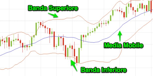 - Se i prezzi si trovano nella parte più alta della banda ci troviamo davanti ad un trend rialzista, mentre se ci trovassimo nella banda più bassa ci troviamo davanti ad un trend ribassista.