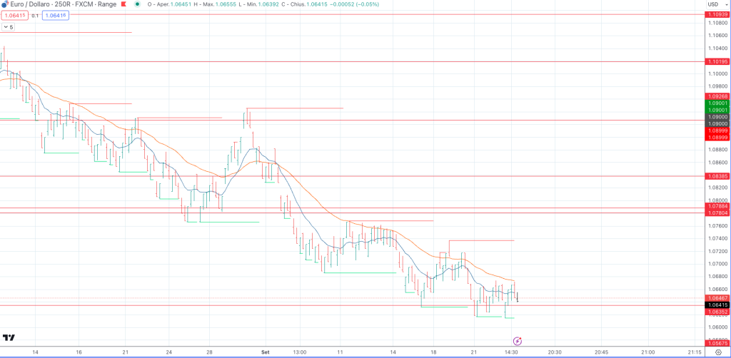 Passando all’analisi dell’andamento dell’euro rispetto al dollaro, notiamo un quadro molto simile a quello della sterlina. Da giovedì 21 settembre, il prezzo si è mantenuto all’interno di un ristretto range, compreso tra 1,0672 e 1,0634, per un totale di circa 40 pips.