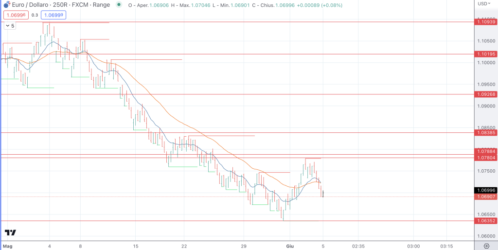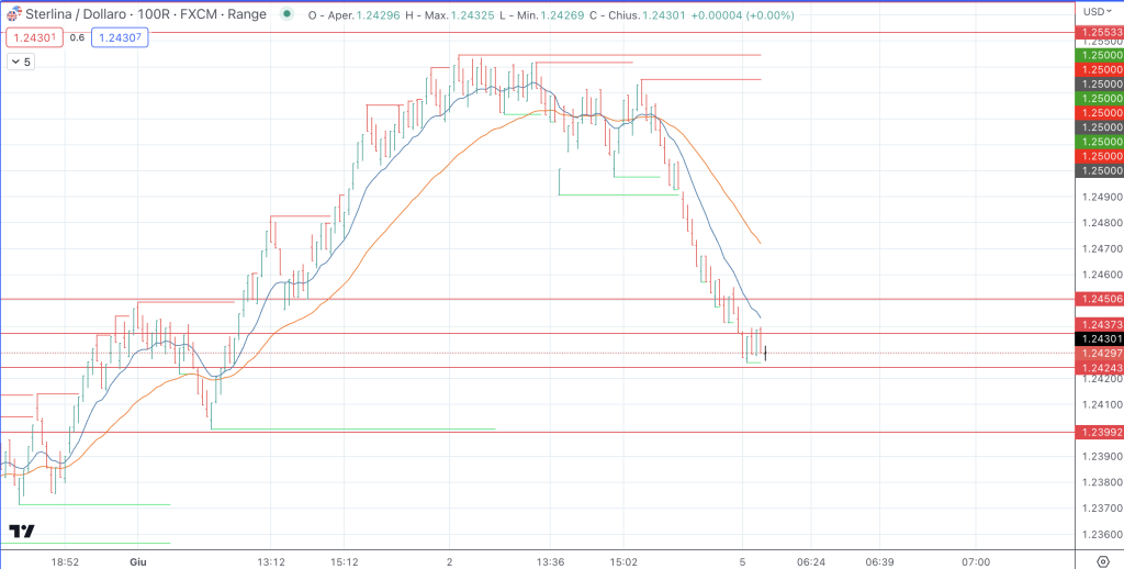 Buongiorno e buon lunedì mattina cari amici e care amiche di Forex Trading Pratico. Partiamo con la consueta analisi del mercato forex del 05/06/2023 su EUR/USD e GBPUSD con le range bars.