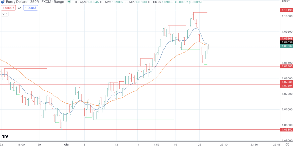 Buongiorno e buon lunedì mattina cari amici e care amiche di Forex Trading Pratico. Partiamo con la consueta analisi del mercato forex del 26/06/2023 su EURUSD e GBPUSD con le range bars.