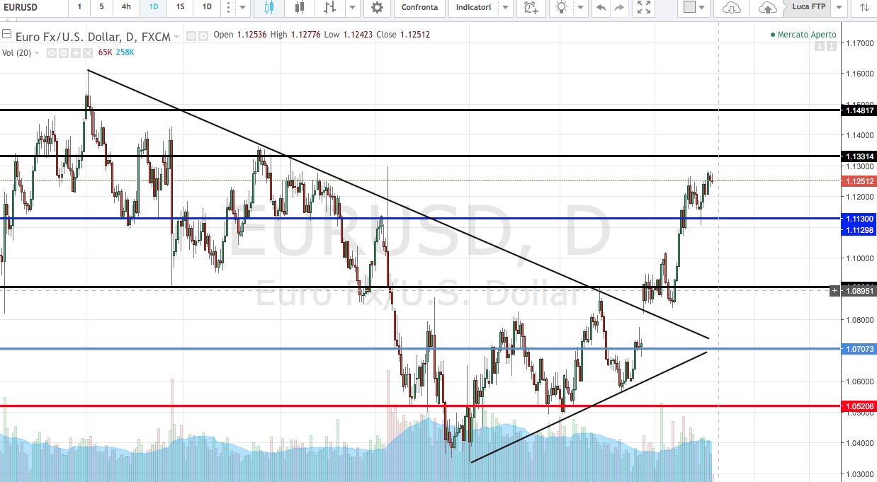 Su questo time frame, il prezzo si sta avvicinando alla resistenza posta in area 1.1331 (ti avevo già avvisato in merito con l’articolo che ho pubblicato due settimane fa). Nel momento in cui il prezzo sarà lì, sarà interessante capire se rimbalzerà oppure continuerà la sua ascesa, andando a ritestare i precedenti massimi relativi in area 1.1480.