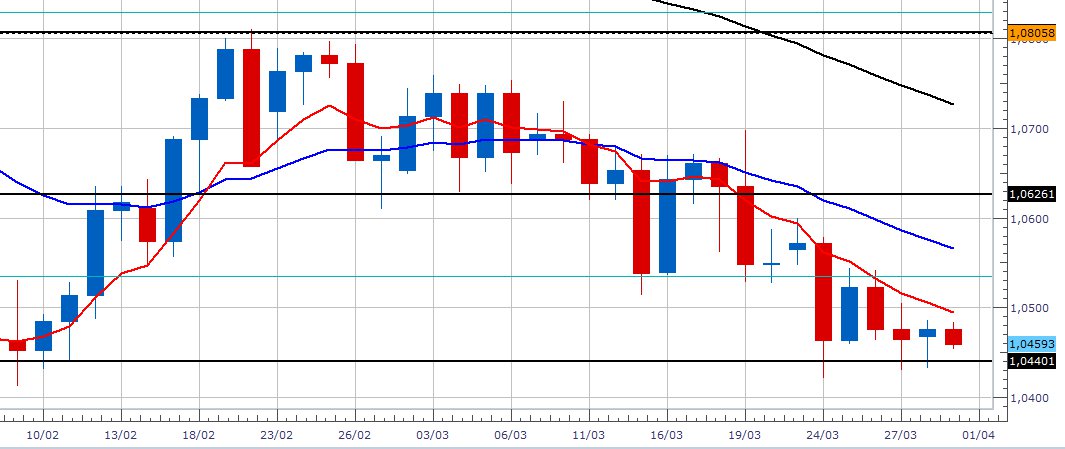 Su questo time frame il cross si trova in una situazione di lateralità di lungo periodo, con supporto posto a 1,045 e resistenza a 1,08. Abbiamo anche una mediana all’interno di questo canale, la quale funge sia da supporto e sia da resistenza posta a 1,0626.