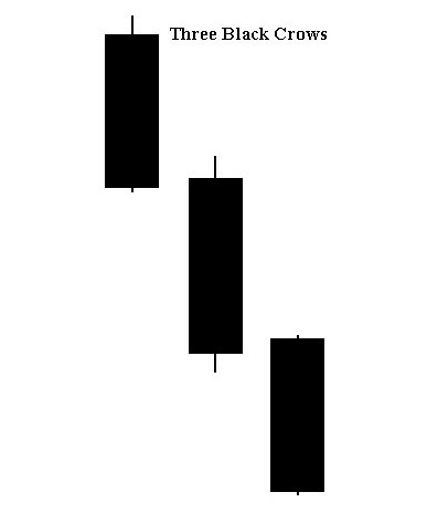 Il three black crows è l’opposto della figura di continuazione descritta pocanzi, ma anche questa deve avere delle caratteristiche. Rispetto però al three white soldiers, questo tipo di pattern non da un segnale immediato di inversione del trend, visto che lo possiamo trovare solitamente a fine di un trend rialzista.