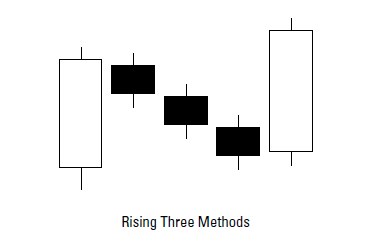 Partiamo a parlare dal Rising Three Methods che è un segnale di trend rialzista formato da cinque candele, di cui la prima è una long white candle, la seconda, la terza  e la quarta sono candele di correzione e la quinta è di nuovo una long white che ci fa capire che riprende il trend rialzista in atto.