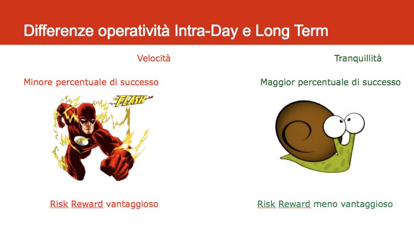 Come possiamo vedere abbiamo alcune differenze che vanno a modificare il nostro stile di trading nelle due occasioni, e per alcuni trader queste differenze potrebbero comportare alcuni errori. Per uno che fa trading di long term, passare a fare trading di breve termine (intra-day) può presentare dei rischi, come viceversa se si passa da breve a lungo termine.