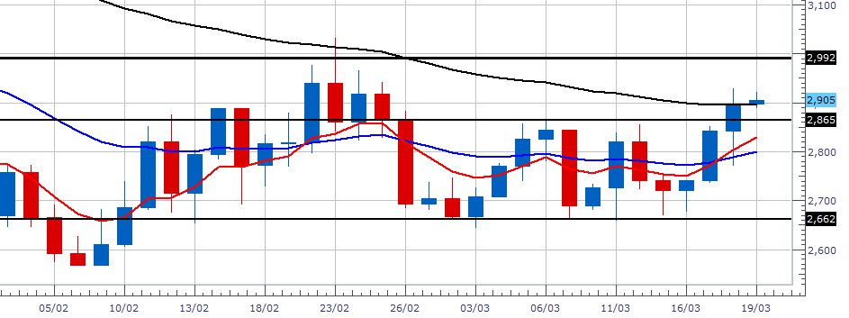 Su questo time frame possiamo notare come lo scorso mese si sia venuta a creare un bella pin-bar. Il prezzo però al momento, non sta rispettando la candela venutasi a creare a febbraio, anzi si sta avvicinando ai massimi: 3.035$.