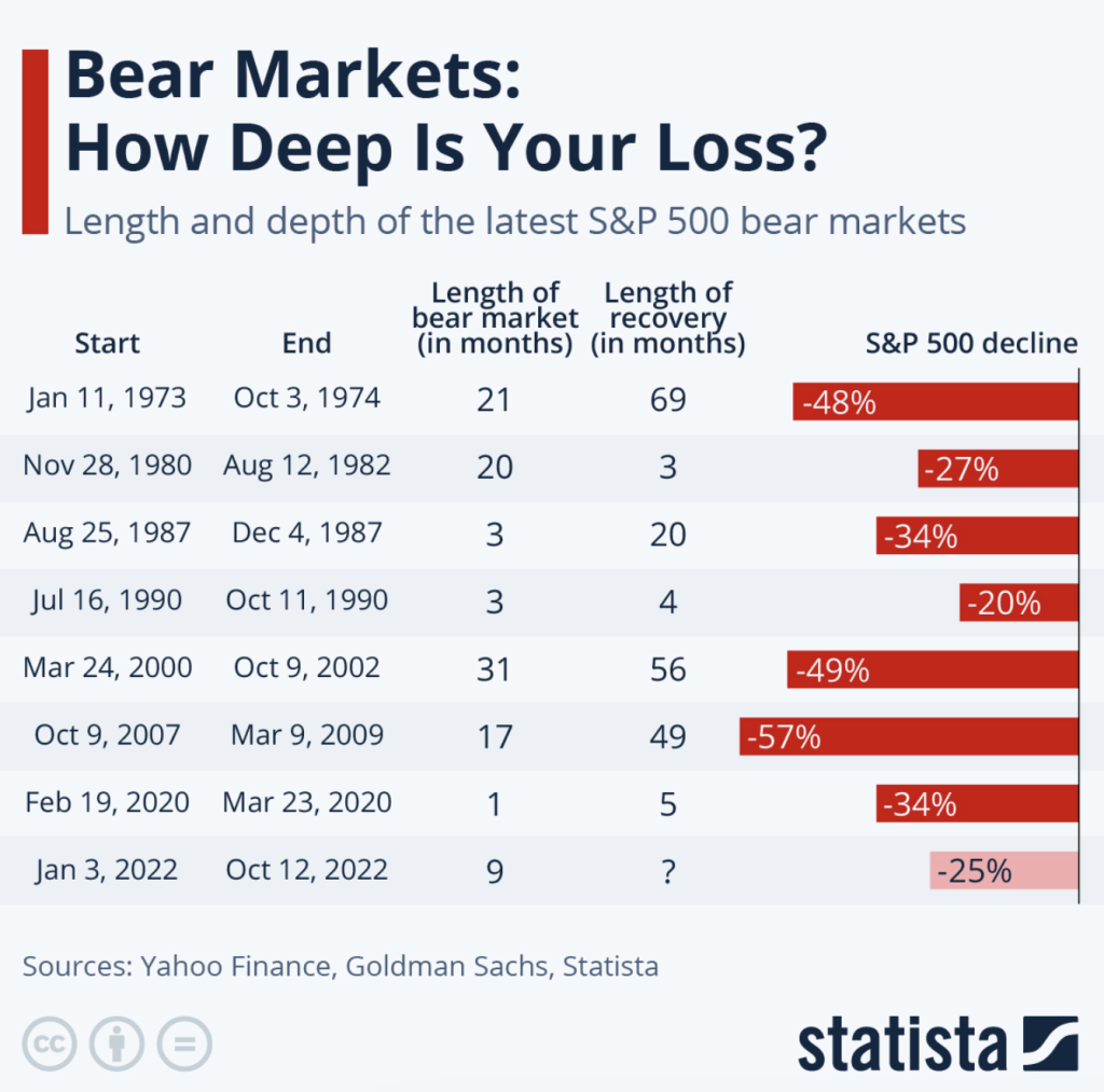 Come osserva Felix Richter di Statista, questo è relativamente innocuo rispetto ad altri recenti mercati ribassisti, come mostra il grafico sottostante, che sono spesso accompagnati da cali del 30% o più e sono durati in media 13 mesi dal 1973.