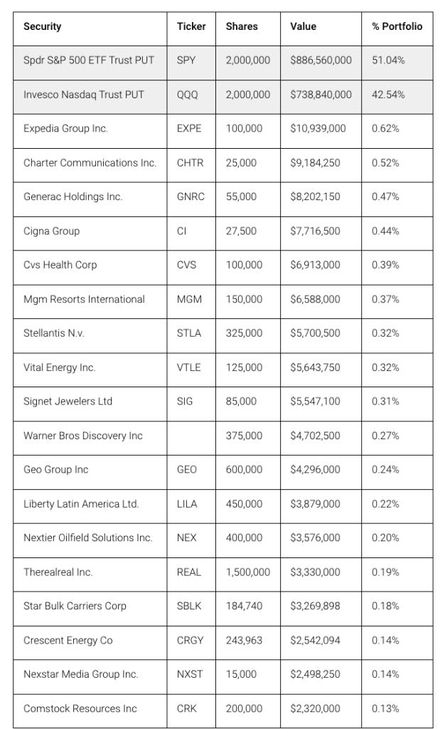 Il suo portafoglio attuale è valutato in un considerevole 1,73 miliardi di dollari. Al centro della sua strategia attuale si trova una considerevole posizione “Big Short”, questa volta mirata al mercato azionario statunitense.