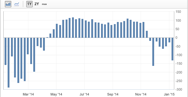 Detto questo, da un punto di vista analitico le scorte dall’ultima rilevazione sono aumentate e questo sta accadendo da novembre del 2014. Questo aumento delle scorte ha fatto si che il prezzo diminuisse drasticamente dal mese preso in considerazione, infatti il prezzo ad oggi ha perso ben 1.400 pip.