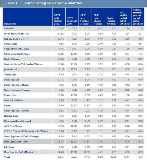 A loro volta, 7 delle banche segnate in rosso sono bocciate solo “ad illo tempore”. Nel 2013 (anno su cui si è svolta la ricerca degli istituti europei, non essendo ancora disponibili i dati del 2014 per ovvie ragioni) quelle banche avevano situazioni patrimoniali inadeguate. Tuttavia, le ingenti ricapitalizzazioni fatte durante lo scorso anno hanno risolto il problema prima che fosse rilevano.