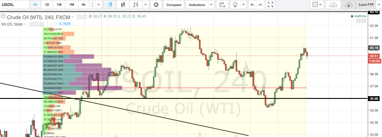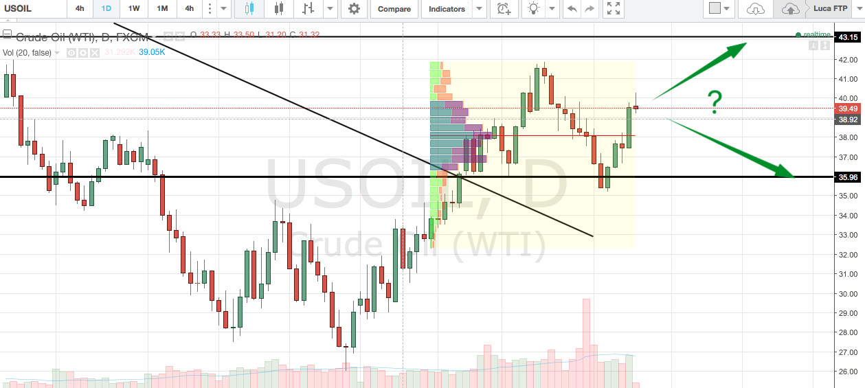 Su questo time frame, puoi notare come il prezzo si trovi all’interno di una fase di lateralità compresa tra i 43,14$ (resistenza) e i 35,96$ (supporto). Sarà interessante vedere nelle prossime sedute di mercato, come si comporterà il petrolio.