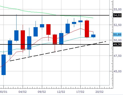 Come possiamo notare dal grafico riportato qui sotto, il prezzo ha cominciato a rimbalzare sul supporto a 49,30$ e sulla resistenza a 54,02$. Le medie mobili di breve, medio e lungo periodo al momento sono tutte e tre molto piatte e stessa cosa ci viene detto sia dall’indicatore dell’RSI e sia dal MACD, il quale al momento si trova appena al di sopra dello 0.