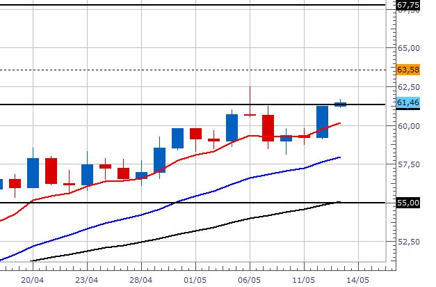 Su questo time frame possiamo notare come il mese scorso il prezzo del petrolio sia balzato da 47$ a quasi 60$ (un rimbalzo che nessuno qualche settimana fa si aspettava). Il target minimo di questo rimbalzo può essere intono ai 67$, da lì in poi ci sarà da stare attenti perchè ci potrebbero essere delle prese di profitto.
