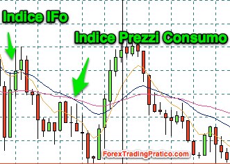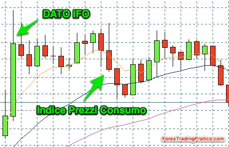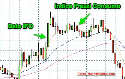 Su questa coppia di valute abbiamo avuto due andature diverse. Nel primo caso, quando è uscito il dato IFO la candela che si è venuta a creare ha avuto un escursione di 24 pip, mentre quando è uscito il secondo dato il prezzo ha avuto una differenza (tra massimo e minimo) di sette pip. Andiamola a vedere insieme nel dettaglio con la foto qua sotto.