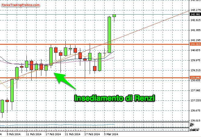 Il 20 febbraio, il cambio era pari a 140.48. Subito dopo la notizia dell’insediamento di Renzi, possiamo notare una lieve tendenza positiva dell’euro a scapito dello yen giapponese: il giorno successivo, infatti, il cambio era pari a 140.66; il 24 febbraio esso è pari a 140.79.