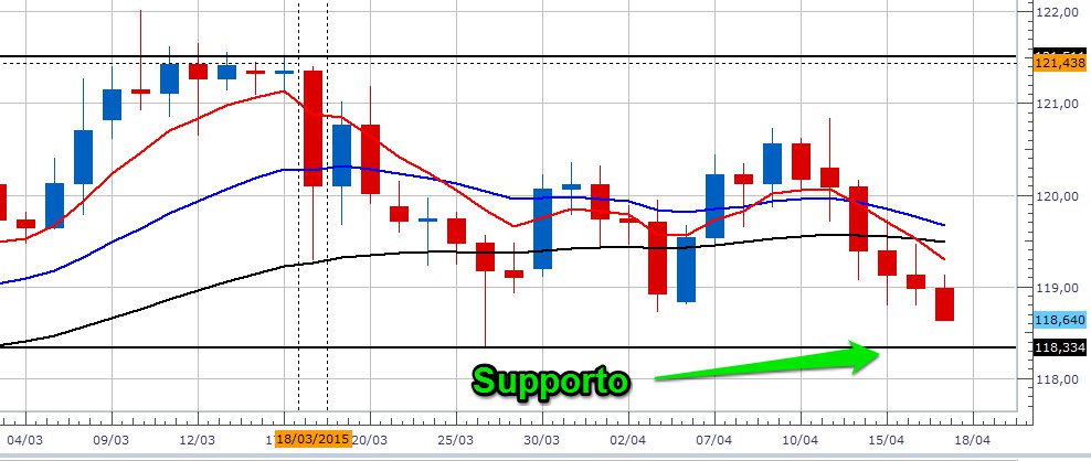 Al momento su questo cross ci stiamo avvicinando ad un supporto/resistenza di lungo periodo posto a 118,33 e una volta raggiunto questo livello, sarà interessante vedere se il prezzo romperà con decisione oppure rimbalzerà, cercando di ritestare i massimi a 121,00.