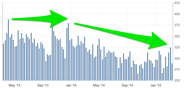 Come possiamo notare dal grafico riportato qui sotto, dal maggio 2013 al gennaio 2014 le richieste dei sussidi di disoccupazione erano tutto sommato stabili. Ma dal gennaio dello scorso anno a questo, possiamo vedere come il trend sia nettamente in calo.