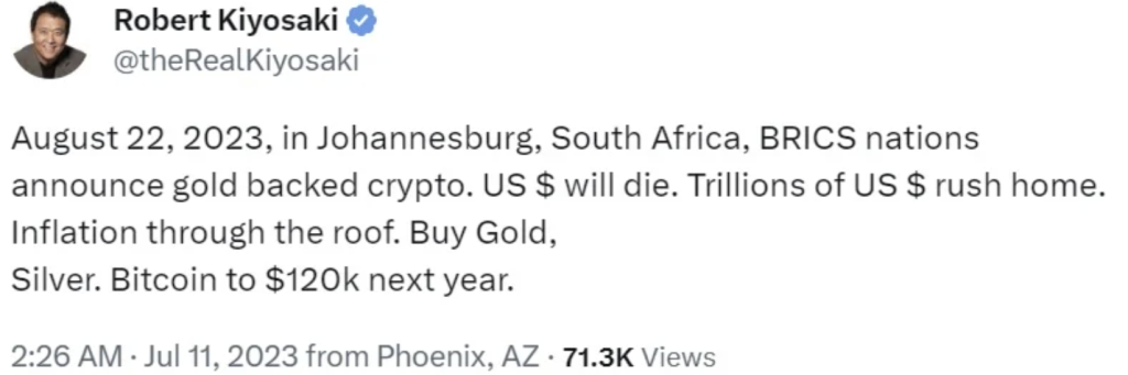 In un tweet di martedì, Kiyosaki ha predetto che il dollaro USA morirà e trilioni di dollari si precipiteranno a casa, poiché si aspetta che le nazioni BRICS annunceranno una valuta sostenuta dall’oro durante il vertice di agosto.