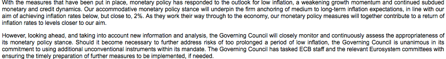 In questa parte del discorso da parte del presidente della BCE, cominciano a prendere piede delle misure straordinarie “se necessarie” per combattere la bassa inflazione. Ricordiamo che l’obbiettivo minimo è quello di avvicinarsi almeno alla soglia del 2%.