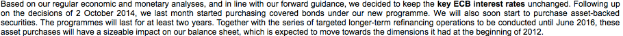 Facendo una rapida traduzione possiamo leggere come la banca centrale continui sulla strada indicata dalla precedente riunione, e cominci l’acquisto di ABS, che avranno durata di almeno due anni, per riportare l’economia europea ai livelli del 2012. Fin qui nulla di nuovo da quello che abbiamo letto dai giornali o visto dai telegiornali in questi giorni.