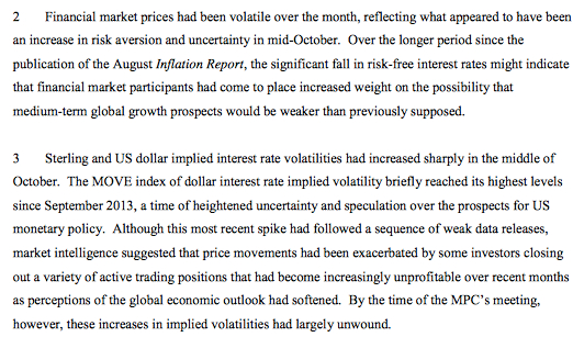 • Immediatamente prima della riunione precedente del Comitato, era stato fornito con una stima anticipata di dodici mesi l’inflazione nel mese di settembre dell’1,2%. Quello era stato di 0,3 punti percentuali al di sotto delle aspettative del personale della Banca prima del rilascio dei dati, e di 0,5 punti percentuali inferiore a quello incorporato nel rapporto di inflazione di agosto.