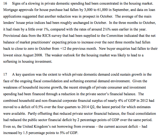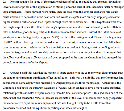 • Una spiegazione per alcuni è la recente debolezza dell’inflazione, potrebbe essere che la manovra per abbassare i prezzi al consumo dell’apprezzamento della sterlina dall’inizio del 2013 è stata più veloce o più forte del previsto.