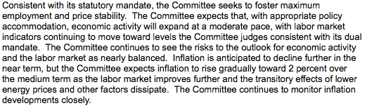 - Si prevede un ulteriore calo dell’inflazione nel breve termine, ma la FED si aspetta che l’inflazione ricomincerà a salire gradualmente verso il 2% nel medio periodo, in concomitanza con il miglioramento del mercato del lavoro e gli effetti di una riduzione dei prezzi nel mercato dell’energia.